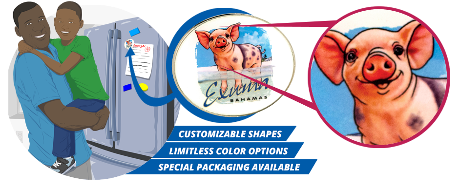 Full color photo insert placed inside a metal mould. Your choice of multiple plating colors for the magnet’s edge.