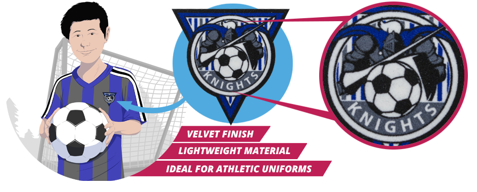 3D flock logos are a great alternative to embroidery. The process allows for high detail. Flock materials are lightweight and soft to the touch with a velvety finish. They are thin, durable and colorfast and can be applied with a heat press to polyester, cotton or nylon materials.